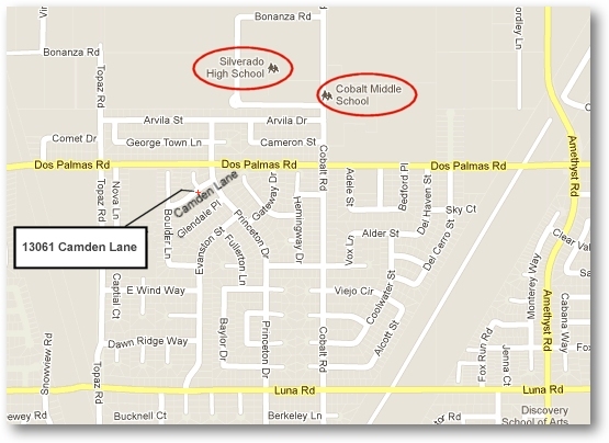 Camden Lane is a quite neighborhood that’s within walking distance to Cobalt Middle School and Silverado High School. Both schools, about 3 blocks away.